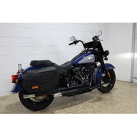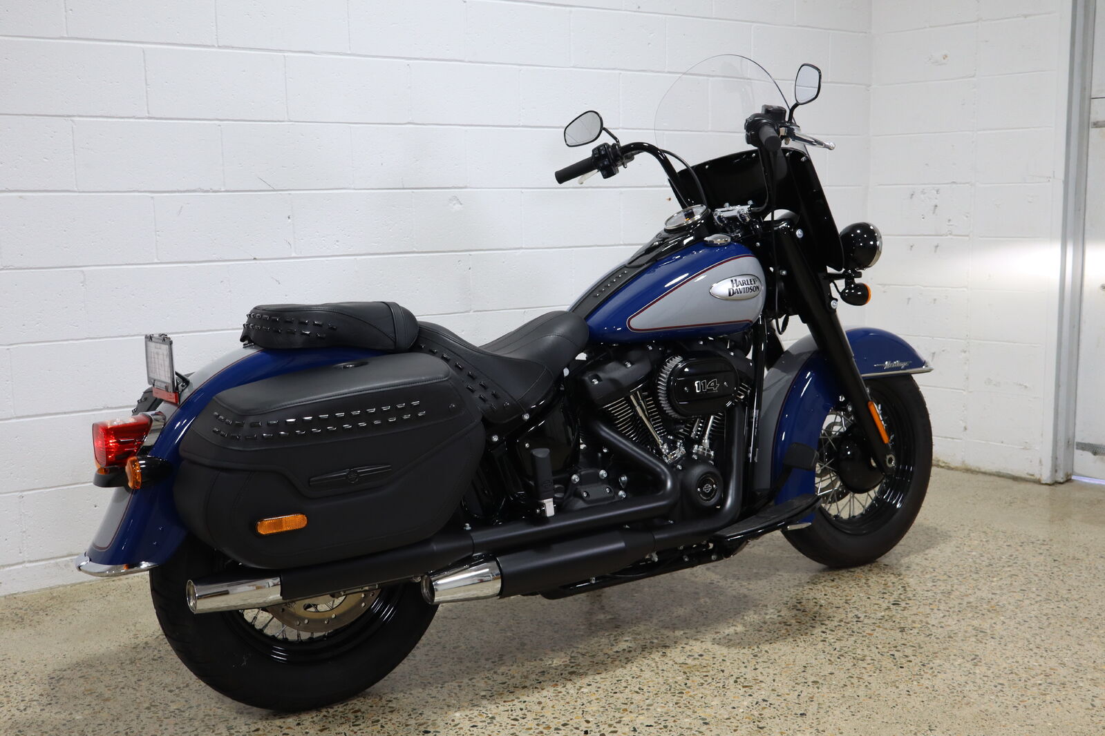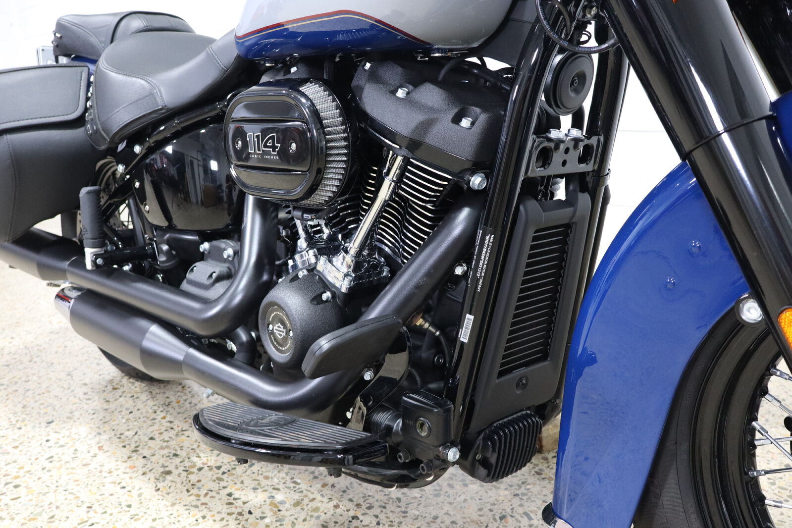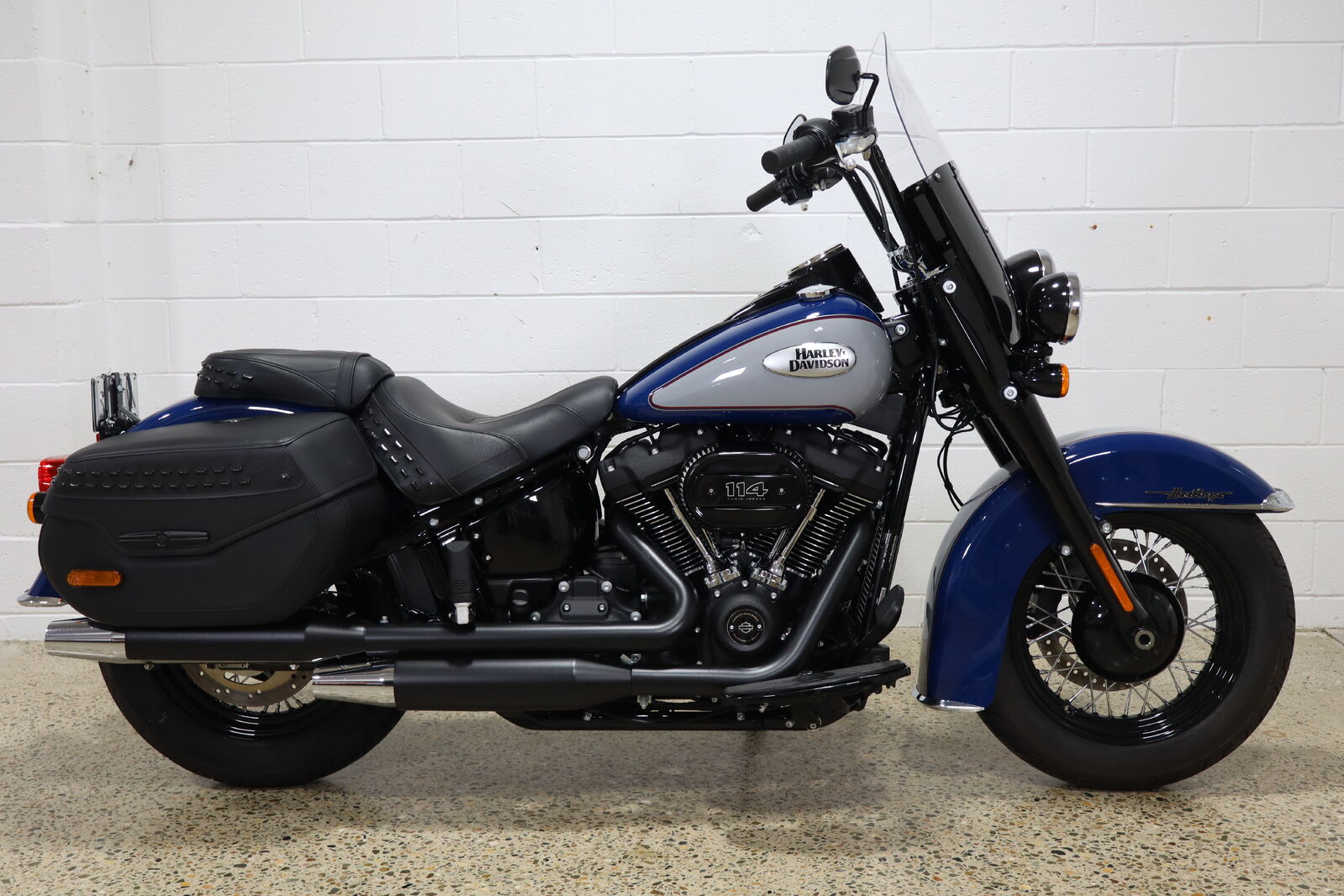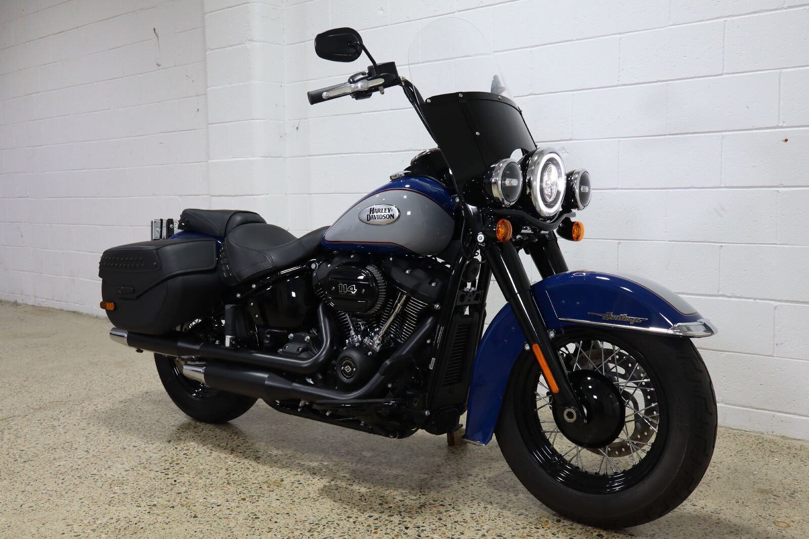 The Harley-Davidson Heritage Classic 114 (FLHCS) in striking blue blends vintage cruiser styling with modern performance, powered by the Milwaukee-Eight® 114 engine for strong, smooth torque. With its nostalgic design, detachable windshield, and matching blue saddlebags, it’s built for riders who want classic looks and long-haul comfort.
