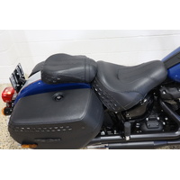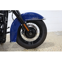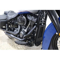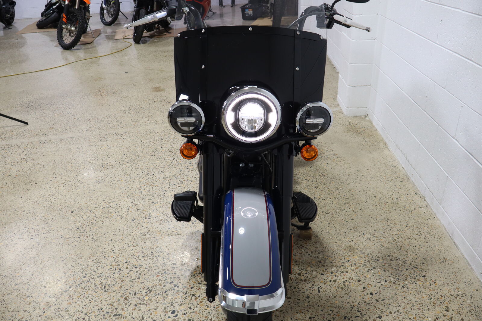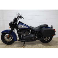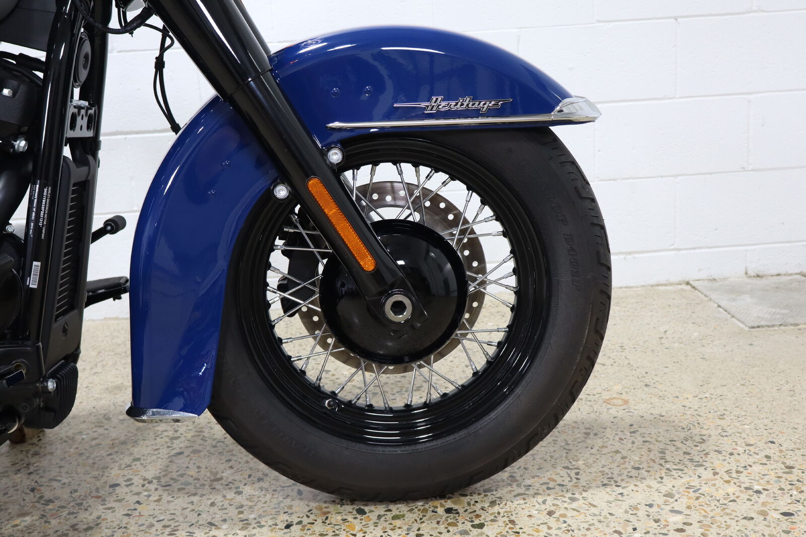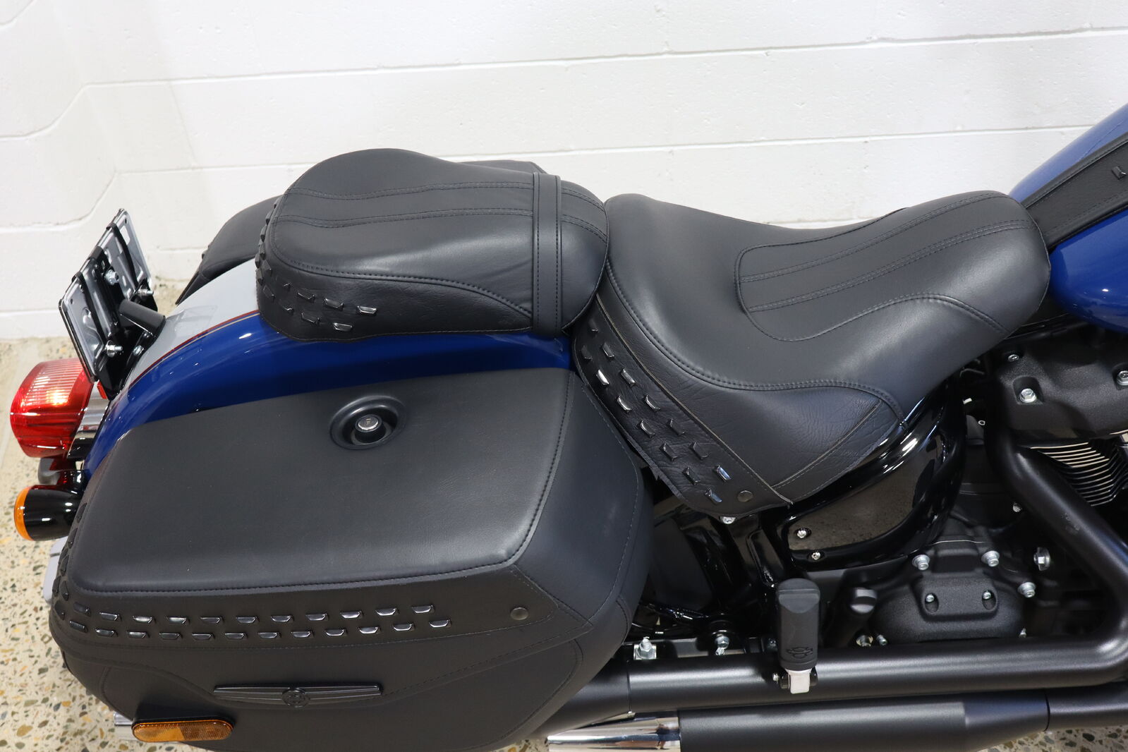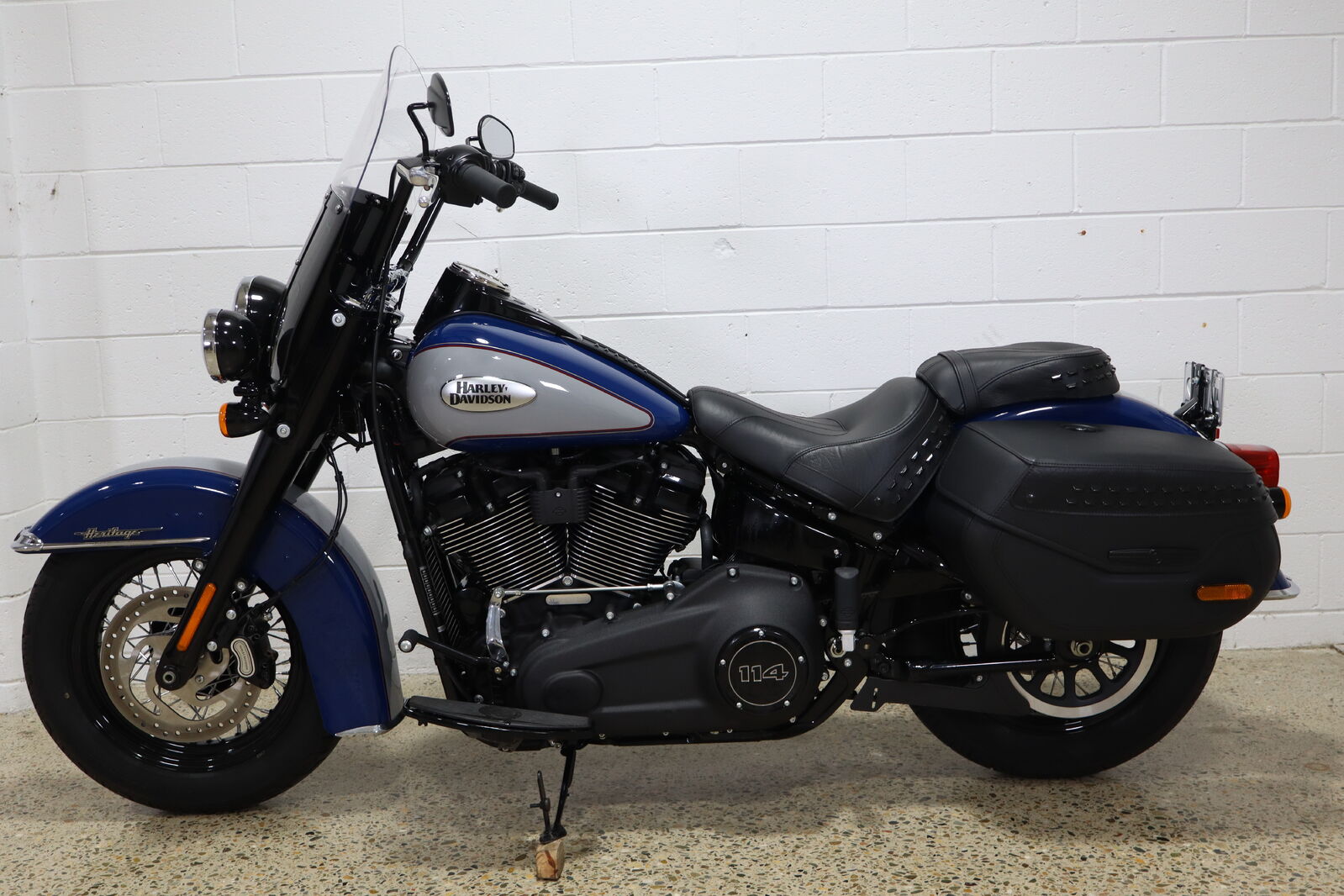 The Harley-Davidson Heritage Classic 114 (FLHCS) in striking blue blends vintage cruiser styling with modern performance, powered by the Milwaukee-Eight® 114 engine for strong, smooth torque. With its nostalgic design, detachable windshield, and matching blue saddlebags, it’s built for riders who want classic looks and long-haul comfort.