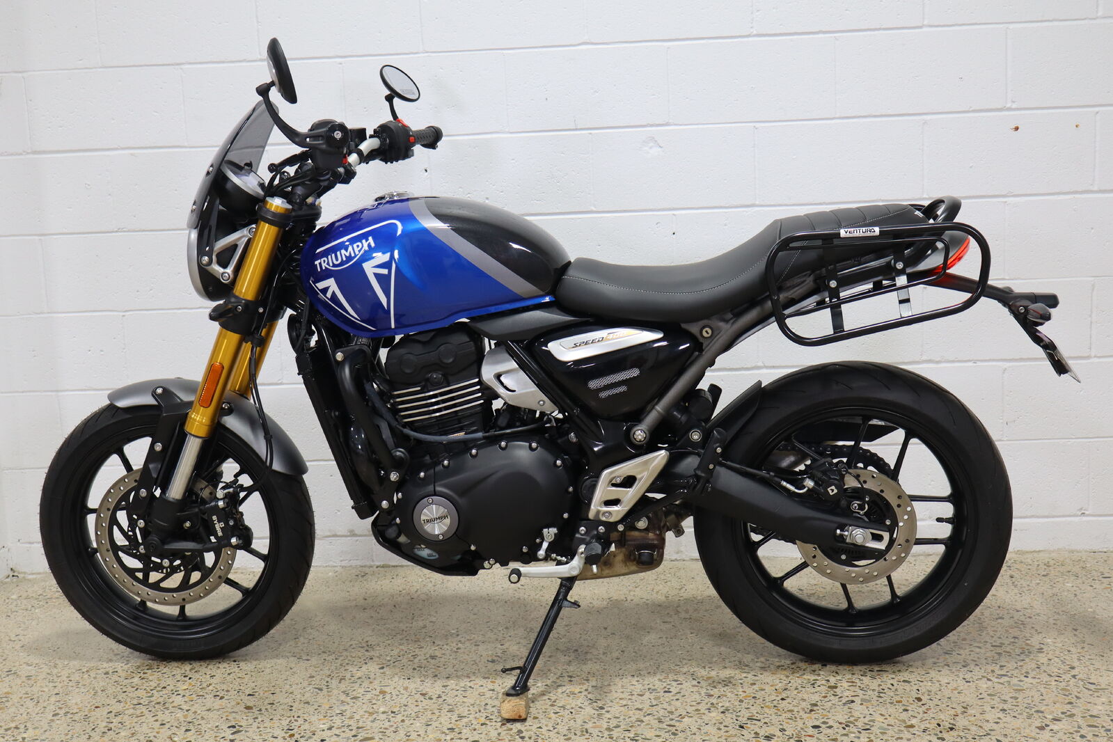 The 2024 Triumph Speed 400 Blue brings timeless British style and modern performance together in a compact, punchy package. Powered by an all-new 398cc single-cylinder engine, it delivers responsive torque, precise handling, and everyday usability—all wrapped in classic Triumph design with a striking blue finish. Lightweight, agile, and packed with premium details, the Speed 400 is built for riders who want character, confidence, and fun in every ride. Big-bike feel, small-bike freedom—this is pure Triumph, distilled.